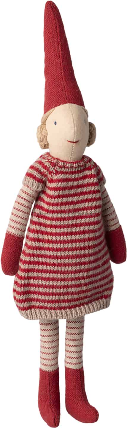Mød din nye juleven fra Mailegs fortryllende verden. Klædt i en hyggelig, strikket kjole med røde og cremefarvede striber er denne lille nissepige klar til at dele varmen og glæden ved jeres families juletraditioner.