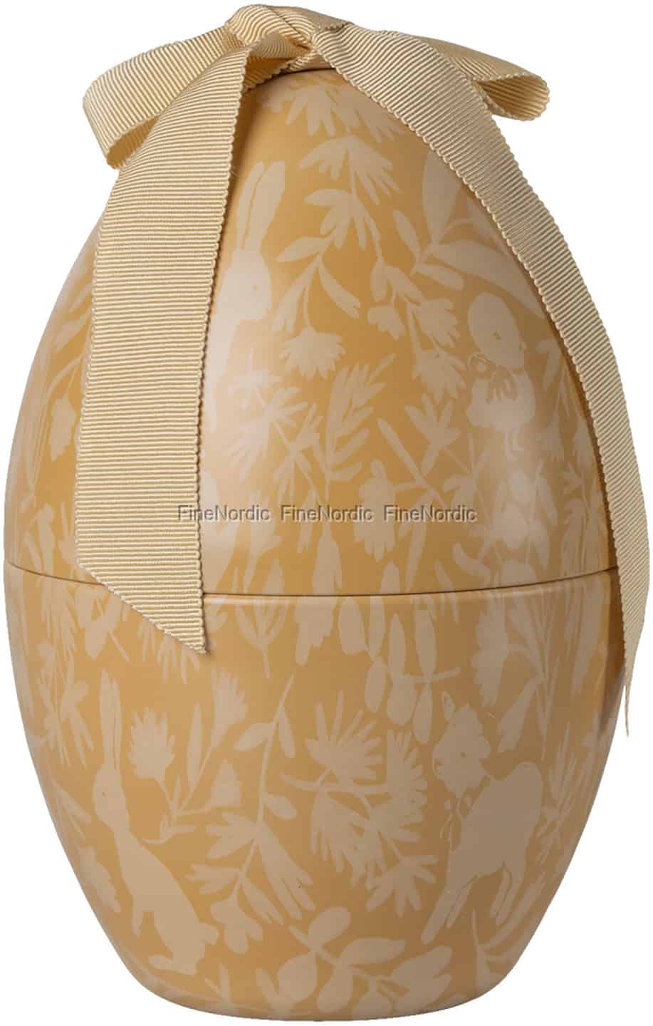 I Skandinavien er påsken en tid for stille fejring, der varsler forårets blide lys' genkomst. Dette udsøgte metalæg fra Maileg indfanger netop denne ånd. Den cremegule overflade er prydet med en fin illustration, hvor generte kaniner og blide lam titter frem fra et blødt tæppe af vilde blomster. Designet er en diskret hilsen til klassiske eventyrbøger, der inviterer dig til at kigge nærmere og opdage de små verdener, der gemmer sig i mønsteret. Afsluttet med et elegant grosgrainbånd føles det mindre som emballage og mere som begyndelsen på et dyrebart minde.