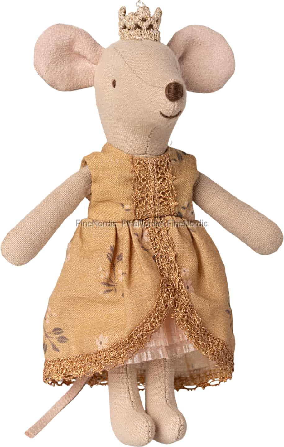 I Mailegs magiske verden har hver figur sin egen historie, og prinsessemusen er klar til sit kapitel i din. Med sit venlige, broderede smil og sin bløde, taktile fornemmelse er hun den perfekte veninde til at dele hemmeligheder og drømme med. Hendes prægtige gyldengule kjole, dekoreret med et fint blomsterprint og fine guldblonder, viser, at hun er klar til enhver kongelig pligt, lige fra at deltage i et storslået bal på Maileg-slottet til at være værtinde for et teselskab med sine venner.