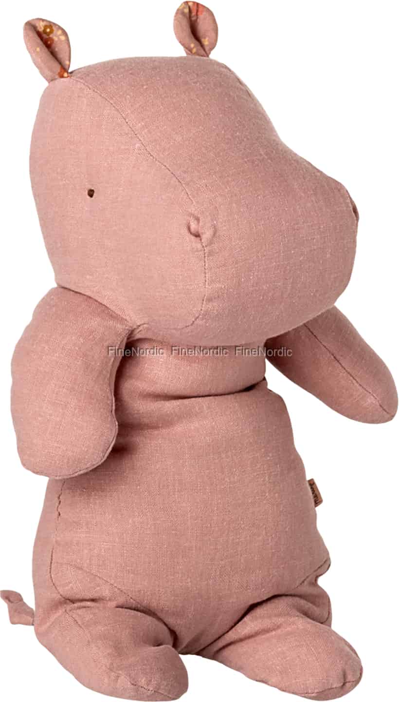 Fra Mailegs fantasifulde verden kommer en ny ven, man kun kan holde af. Safari-flodhesten er en mild sjæl med en blød, støvet rosa krop lavet af et dejligt, taktilt tekstil, der indbyder til uendelige kram. Dens søde, enkle udtryk vækkes til live med omhyggeligt broderi, og et kig ind i ørerne afslører et charmerende blomsterprint – en hemmelig detalje, der hvisker om lange eftermiddage på en solbeskinnet eng. Dette er ikke bare et stykke legetøj; det er en følgesvend til historiefortælling og en vogter af hemmeligheder.