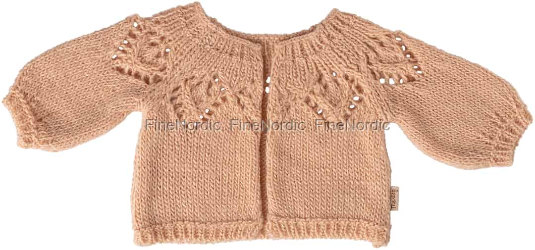 Hold din kære Maileg kanin dejligt lun med denne udsøgt detaljerede cardigan. Strikket i en blød, lys rosa nuance er den det perfekte lille lag til teselskaber om eftermiddagen, opdagelser i haven og stille stunder med fantasifuld leg.