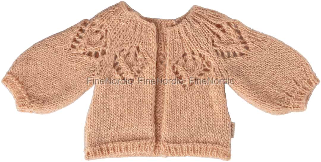 Forbered din kære Maileg-ven på køligere dage og hyggelige stunder. Denne smukt udformede cardigan i en blød, lys rosa nuance tilføjer et strejf af varme og personlighed, der gør eventyrlige fortællinger endnu mere magiske.