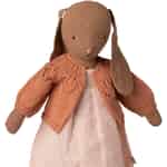Forestil dig din kære Maileg-kanin, klar til en tur på torvet eller en gåtur i skoven, svøbt i den blide varme fra denne udsøgte cardigan. Den yndige vintage rose-farve leder tankerne hen på de bløde kronblade fra en falmende sommerblomst og tilføjer et blidt farvestrejf til outfittet. Med sit fine, blad-lignende mønster over bærestykket og de søde pufærmer er denne lille trøje et vidnesbyrd om den omhu og detaljerigdom, der definerer Mailegs verden. Den er mere end blot et stykke tilbehør; den er en invitation til at skabe nye historier og eventyr.
