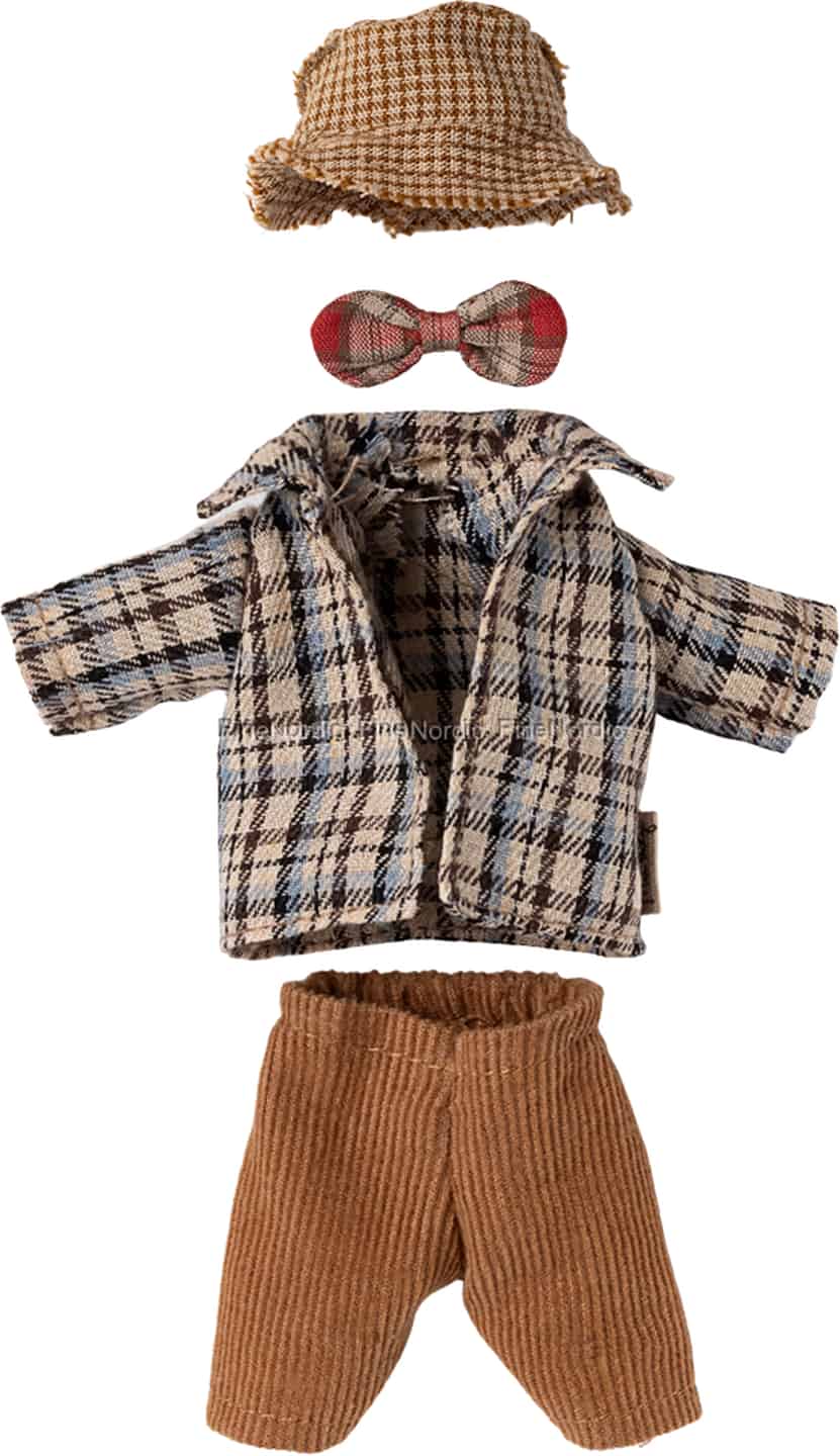 Forbered din kære Maileg-mus på et nyt kapitel i livet med dette udsøgt detaljerede bedstefarsæt. Den flotte, ternede jakke med sine diskrete blå nuancer passer smukt sammen med de robuste, brune fløjlsbukser og skaber et look af tidløs, landlig charme. For at fuldende hans fornemme udseende tilføjer en fiks lille butterfly et strejf af farve, mens hatten med pepitatern og sin flossede kant giver et skær af mild visdom.