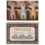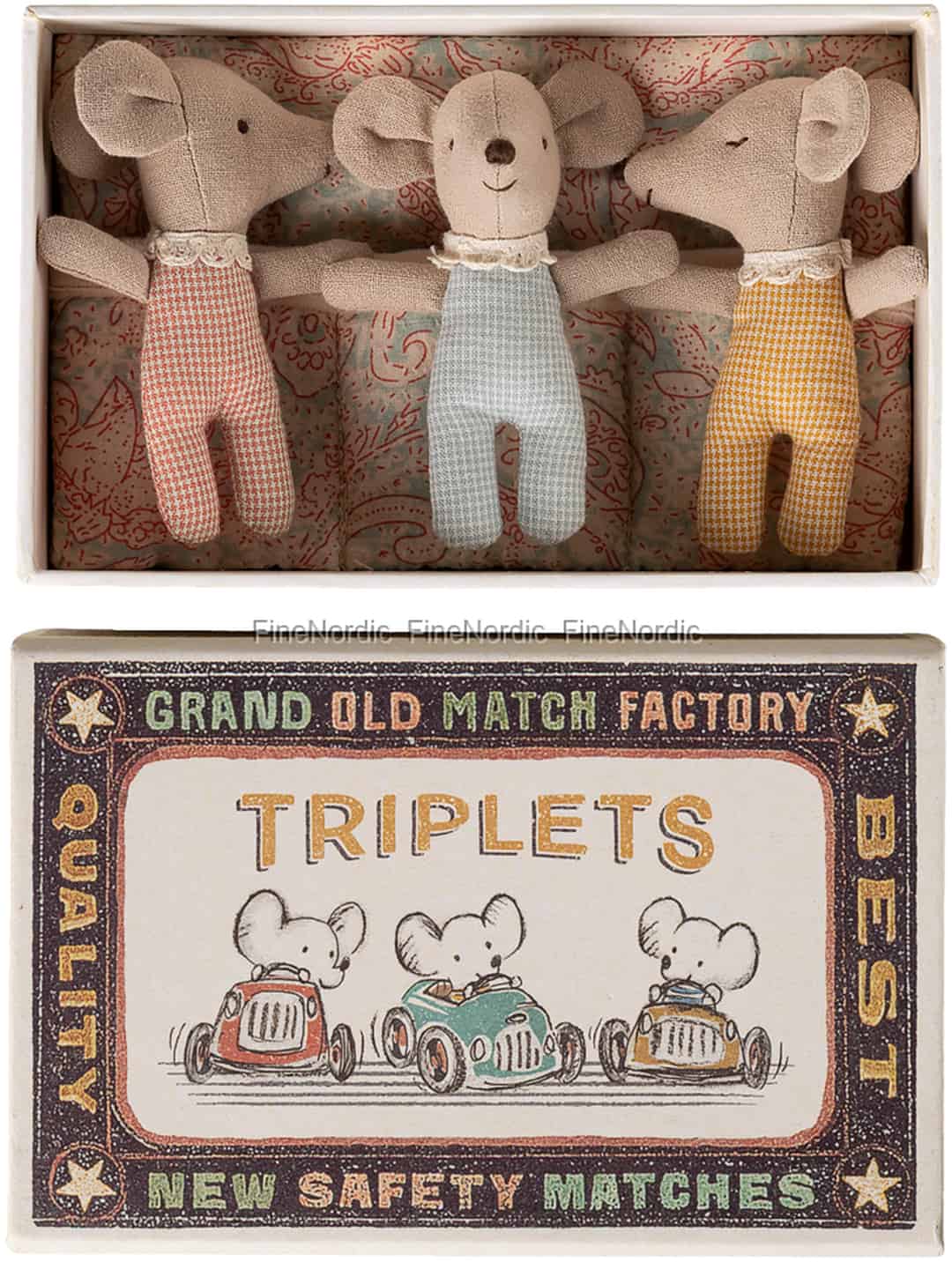 I et stille hjørne af børneværelset venter en lille historie på at udfolde sig. Skub den vintage-inspirerede tændstikæske op, og mød Maileg-trillingerne. Den ene er søvnig, den anden smiler, og den tredje er klar til sjov, men de er altid sammen. Klædt i bløde, ternede dragter i rosa, himmelblå og varm gul ligger de puttet på deres fælles blomstrede madras og drømmer om dagens eventyr.
