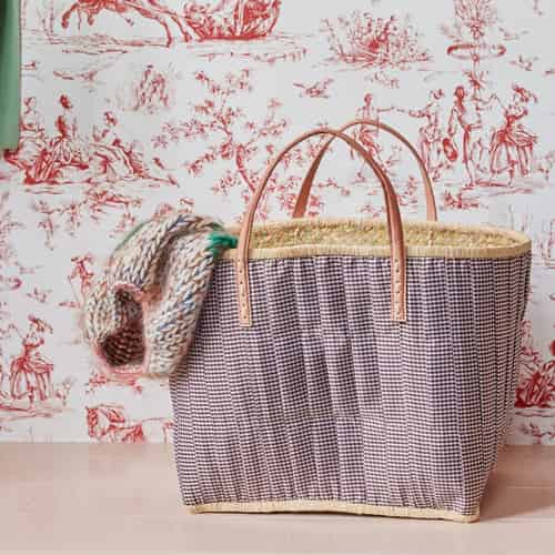Rice Raffia Indkøbstaske - Stofdækket - Læderhåndtag - Brun Vichy - Stor