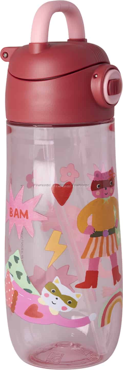 Flasken er fremstillet af slidstærkt plastik og er designet til at kunne holde trit med aktive børns energiniveau. Det gennemtænkte design inkluderer et letanvendeligt pop-op-sugerør og et behageligt håndtag, perfekt til at have med på farten. Det er et praktisk og glædesfyldt valg for forældre, der værdsætter både funktion og den simple glæde ved et veldesignet, børnevenligt tilbehør. Lad den være en munter påmindelse til din lille om at holde sig frisk og hydreret, mens de leger og vokser.