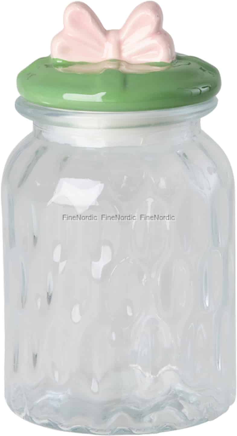 Rice er kendt for at bringe farver og glæde ind i hjemmet, og denne smukke opbevaringskrukke er et perfekt eksempel på deres filosofi. Den er designet til at få dig til at smile. Det klare glas med de små fordybninger føles solidt i hænderne og giver et dejligt kig til indholdet. Men det er låget, der virkelig stjæler hjertet – en levende grøn keramikbase kronet med en perfekt formet, sart lyserød sløjfe. En legende detalje, der forvandler en simpel krukke til en dekorativ skat.