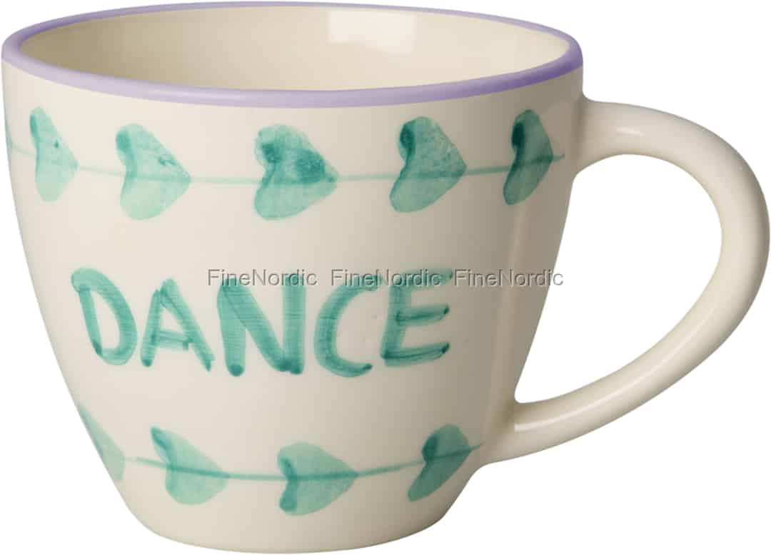 Denne vidunderlige jumbokop fra Rice er mere end blot en beholder til din yndlingsdrik; den er en daglig invitation til at omfavne livet med et let hjerte. Ordet 'DANCE', malet med sorgløse penselstrøg i en glad turkis farve, fungerer som en blid påmindelse om at finde din egen rytme, selv på de travleste morgener. Den glatte, cremefarvede keramik føles skøn at holde om, og dens generøse størrelse lover et sandt øjeblik af hygge og ro. Hver detalje, fra den søde række af hjerter til den bløde, syrenfarvede kant, er designet til at få dig til at smile.