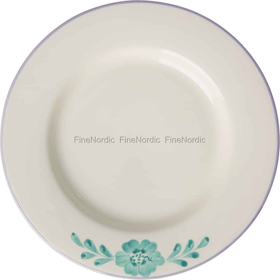 - Diskrete, glade farver: Den bløde råhvide bund, det fine grønne motiv og den sart lilla kant skaber en blid farvepalette, der er let at mikse og matche med dit eksisterende service.