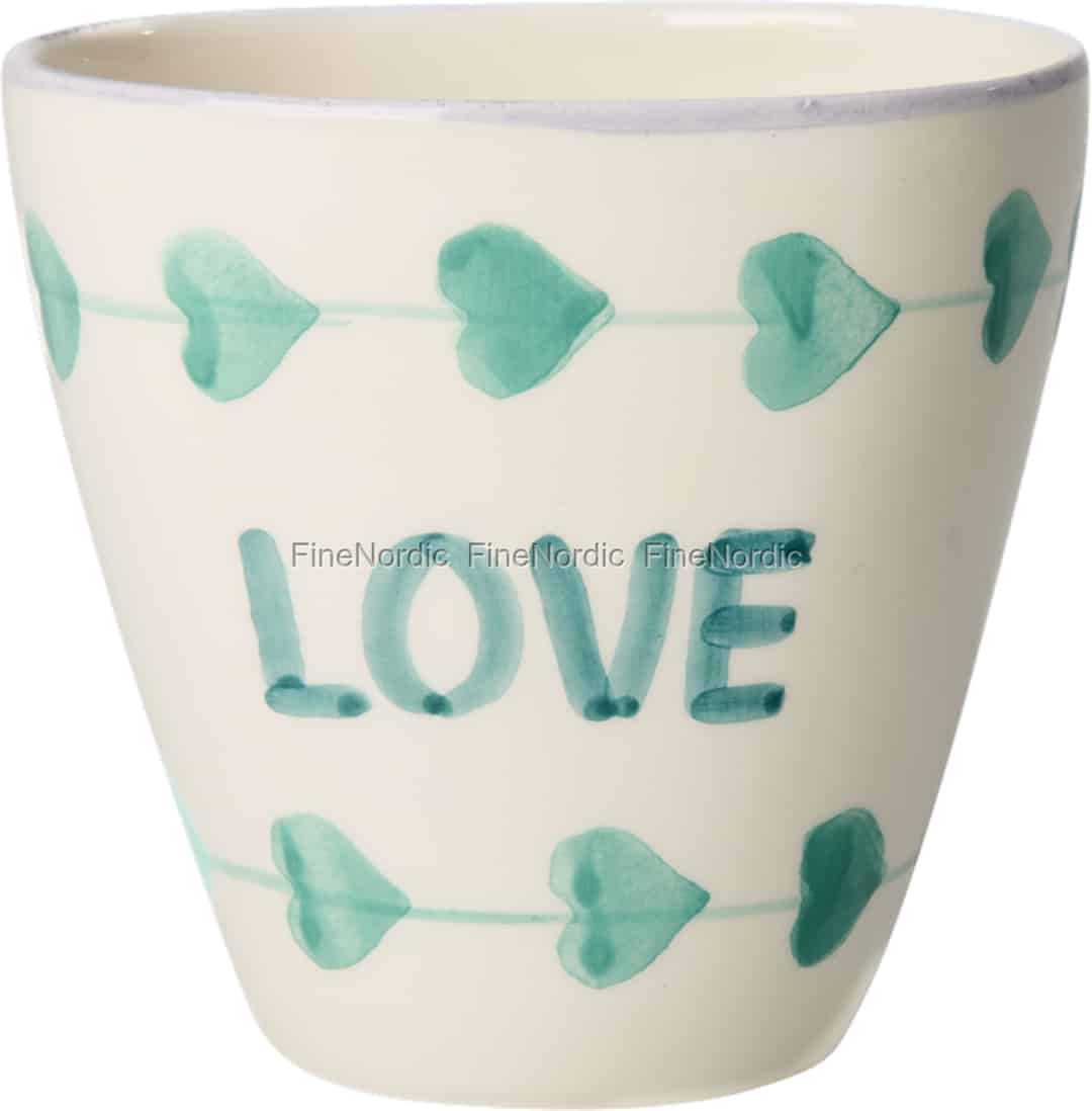Forestil dig en stille morgen, hvor du varmer hænderne om denne vidunderligt glade kop. Fra Rice, et mærke kendt for at bringe glæde ind i hjemmet, er denne kop en lille fejring af hverdagslykken. De håndmalede grønne hjerter og det enkle budskab 'LOVE' er gengivet med smukke, lette penselstrøg, der giver hver kop sin egen personlighed. Den fine lilla kant tilføjer et sidste, gennemtænkt strejf – et hviskende pust af farve, der fuldender det charmerende design.
