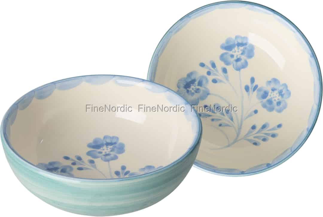 Rice Keramikskål - Håndmalede blå blomster - Grøn