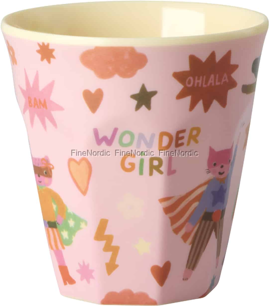 Fra Rice' kreative verden kommer en kop, der er mere end bare service; den er en invitation til leg. Denne lyserøde melaminkop hylder den modige ånd i ethvert barn med sit finurlige 'Hero'-print. Med en venlig superheltepige og en kat med kappe minder den dem om, at hver dag byder på et nyt eventyr. Den bløde cremefarvede inderside skaber en fin kontrast, der får enhver drik til at se endnu mere indbydende ud, mens de lægger store planer.