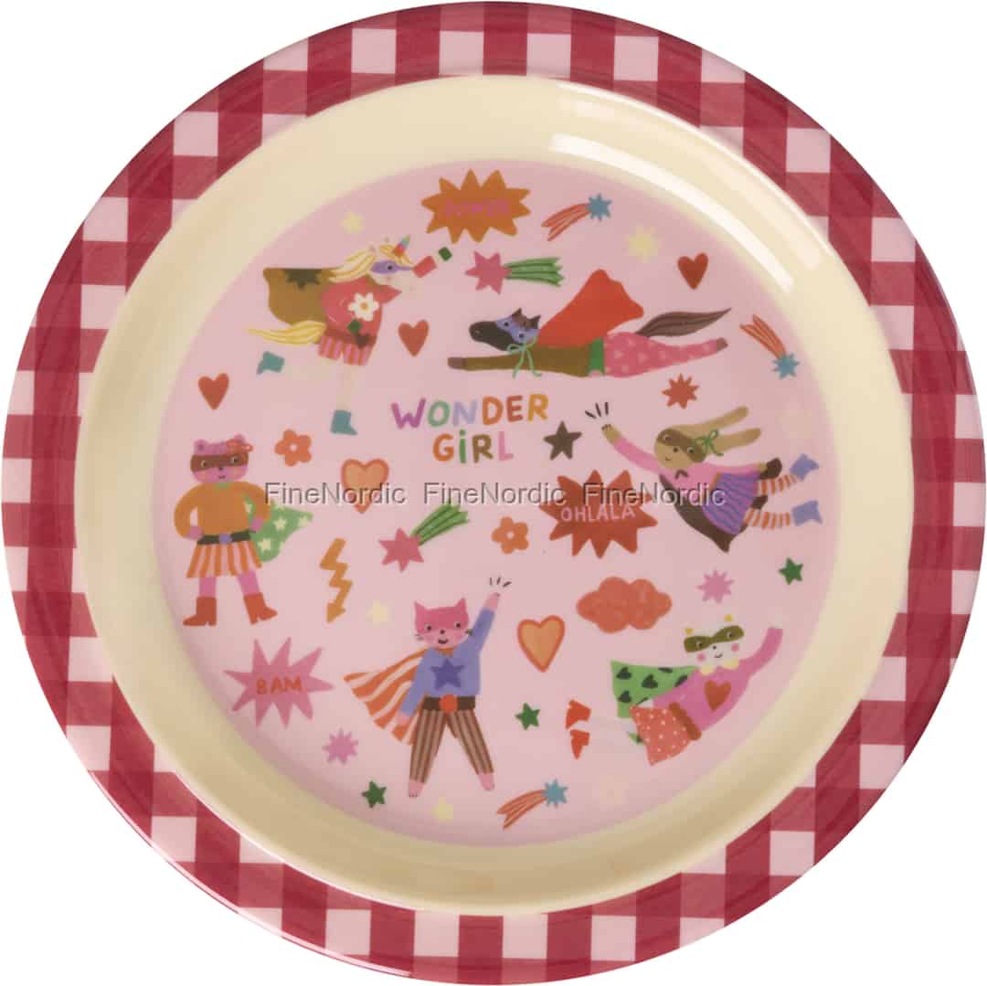 Fra det anerkendte danske mærke Rice er denne "Hero"-tallerken mere end bare service; den er en invitation til en verden fuld af eventyr. Den glade, røde gingham-ternede kant indrammer en scene af ren glæde, hvor hver figur er klar til action. Forestil dig din lille guldklump, der peger på sin yndlingshelt og finder på historier om deres bedrifter, mens frokosten nydes. "Wonder Girl"-motivet hylder styrken og kreativiteten i hvert barn, hvilket får selv et simpelt mellemmåltid til at føles som en særlig begivenhed.
