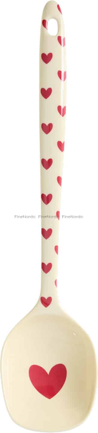 Denne ske er designet til hjertet af dit hjem, hvor minder skabes og deles omkring bordet. Dens holdbare konstruktion betyder, at den vil være din trofaste følgesvend til utallige familiemorgenmåltider og hyggelige middagsforberedelser. De livlige "Red Kiss"-hjerter står smukt frem mod den cremefarvede bund og bringer et strejf af klassisk skandinavisk farve til din daglige rutine. Det er et produkt, der kombinerer Rice's karakteristiske legesyge med praktisk anvendelighed i hverdagen.
