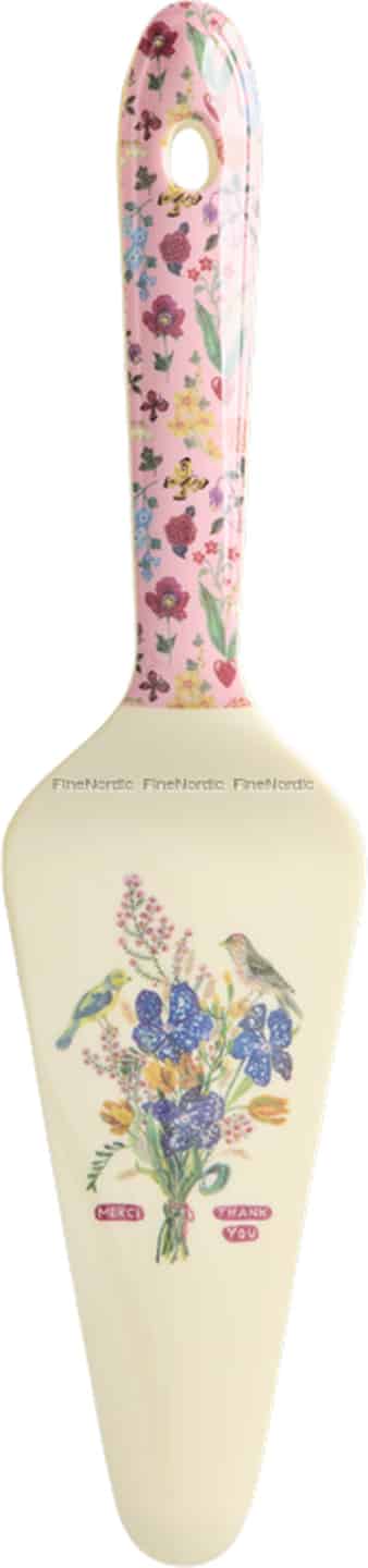 Opdag den franske kunstner Nathalie Létés fortryllende verden med denne smukke melamin-kagespade fra Rice. Hver detalje er designet til at glæde, lige fra de charmerende fugle på en blomsterbuket til de små, tankevækkende 'Merci' og 'Thank You' beskeder på bladet. Den cremefarvede bund udgør et perfekt lærred for kunstværket, mens håndtaget sprudler med et kontrastfyldt pink blomsterprint, hvilket skaber et redskab, der er lige så meget et kunstværk som et funktionelt køkkenredskab. Den føles let, men robust i hånden, klar til at servere dine yndlingskager.