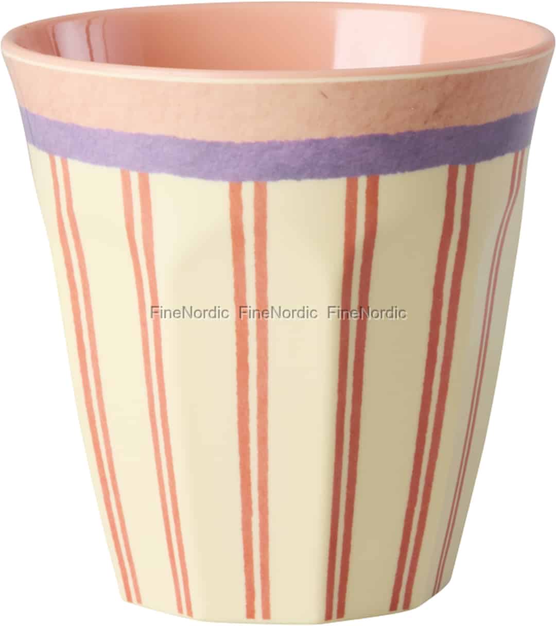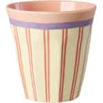 Rice er kendt for at bringe farve og glæde ind i hjemmet, og 'Stripey Love'-koppen er et perfekt udtryk for denne filosofi. Den charmerende kombination af koralrøde og cremefarvede striber, fremhævet af et markant lilla bånd og en blød, lyserød inderside, skaber et design, der er både legende og stilfuldt. Det er ikke bare en genstand, der holder din drik; den rummer en lille smule lykke, designet til at få dig til at smile, hver gang du bruger den. Det slidstærke melamin føles solidt og glat i hånden – en pålidelig ledsager i hverdagen.