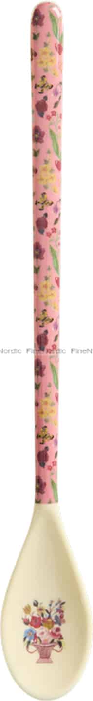 Det gennemtænkte design fortsætter på det cremefarvede skehoved, hvor en charmerende lille buket står i en vase. Skeen er fremstillet af slidstærkt melamin og er ikke kun en fryd for øjet; den er en praktisk ledsager til dine daglige ritualer. Uanset om du blander en skummende latte, en forfriskende saft eller serverer en fin dessert, gør dens slanke form og glade mønster øjeblikket lidt mere mindeværdigt.