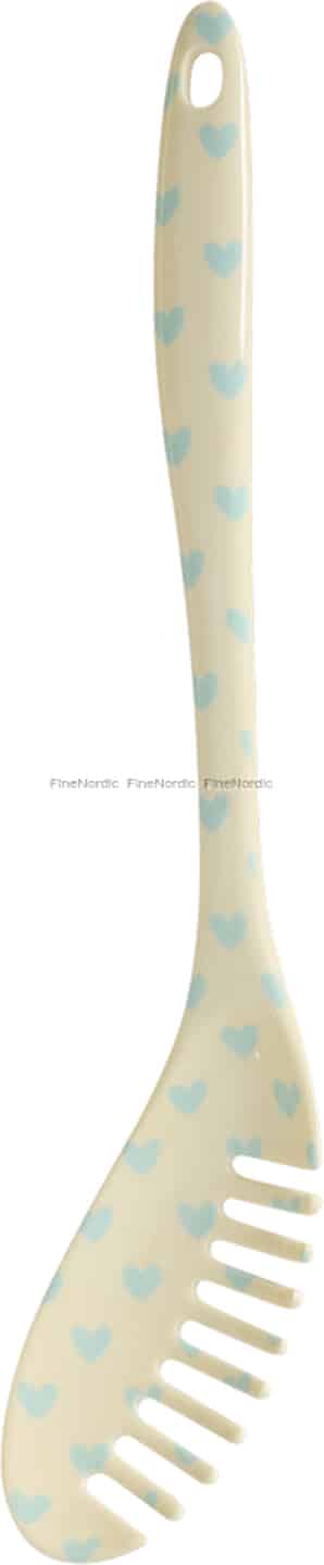 Fra hjertet af Danmark giver Rice dig et køkkenredskab, der er mere end blot funktionelt – det er et lille stykke lykke. 'Favorite Hearts' pastaskeen er en hyldest til de små, glædelige øjeblikke, der gør et hus til et hjem. Dens cremefarvede base danner det perfekte lærred for et legende mønster af myntefarvede hjerter, som tilføjer et finurligt strejf til din hverdagsrutine. Den blanke melamin føles glat og solid i hånden og forvandler den simple handling at servere et måltid til en mere betænksom og værdsat oplevelse.