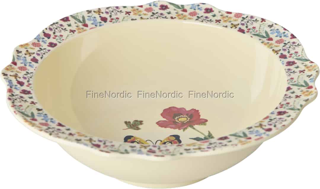 Lad hvert måltid føles som en gåtur gennem en solbeskinnet fransk have. Denne fortryllende skål er en del af et særligt samarbejde mellem Rice og den anerkendte kunstner Nathalie Lété, hvis værker er kendt for deres farverige og poetiske stil. Den cremefarvede melamin danner et blidt lærred for den historie, der udfolder sig indeni: en levende valmue og en fin sommerfugl, der venter på at blive opdaget i bunden af din tallerken. Den brede, bølgede kant er et mesterværk i sig selv, dekoreret med et tæppe af små, vilde blomster, der vækker minder om skovture og varme eftermiddage.