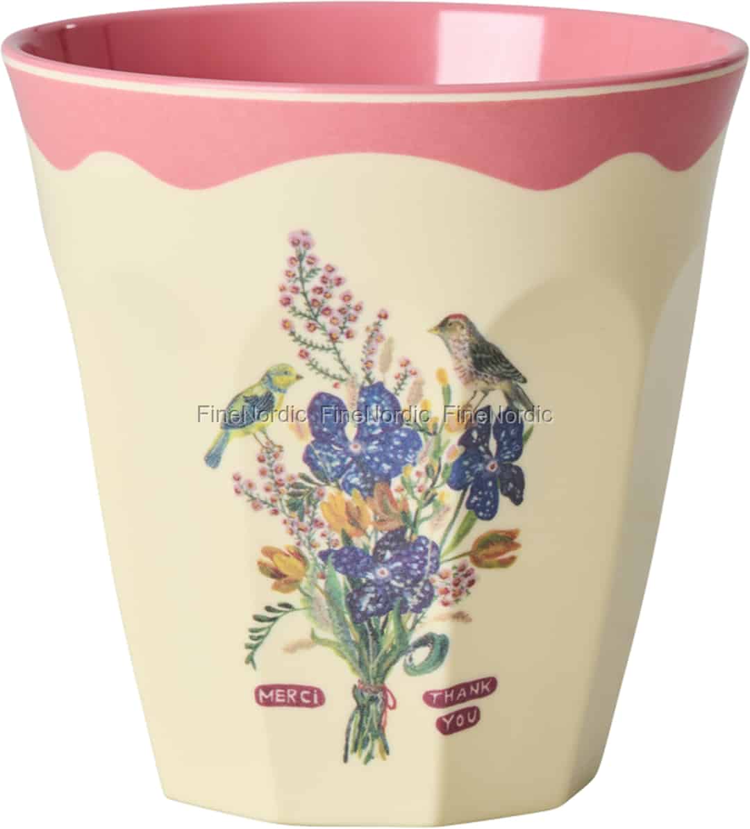 Oplev et produkt, der er lige så praktisk, som det er poetisk. Denne mellemstore kop fra Rice er en del af et særligt samarbejde med den anerkendte franske kunstner Nathalie Lété. Hendes karakteristiske, finurlige stil er smukt fanget i den detaljerede illustration af en buket vilde blomster, fuldendt med to charmerende små fugle. Ordene 'Merci' og 'Thank You' er fint flettet ind i designet, hvilket forvandler hver en slurk til et lille øjeblik af taknemmelighed. Den bløde, cremefarvede yderside udgør et perfekt lærred for kunsten, mens den kontrastfulde koralrosa inderside tilføjer et glædesfyldt farvestrejf, der helt sikkert vil få dig til at smile.