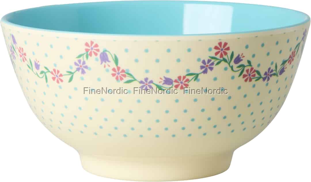 Rice er kendt for deres filosofi om "farver, sjov og funktionalitet", og her præsenterer de en skål, der er en sand hyldest til livets enkle glæder. Det yndige design med et væld af små blomster på en baggrund af glade prikker leder tankerne hen på en solbeskinnet skandinavisk sommereng. Den kontrastfulde himmelblå inderside er en dejlig overraskelse – et skjult farvestrejf, der lyser op ved hver eneste skefuld. Dette er ikke bare en skål; det er en daglig påmindelse om at finde lykken i de små detaljer.