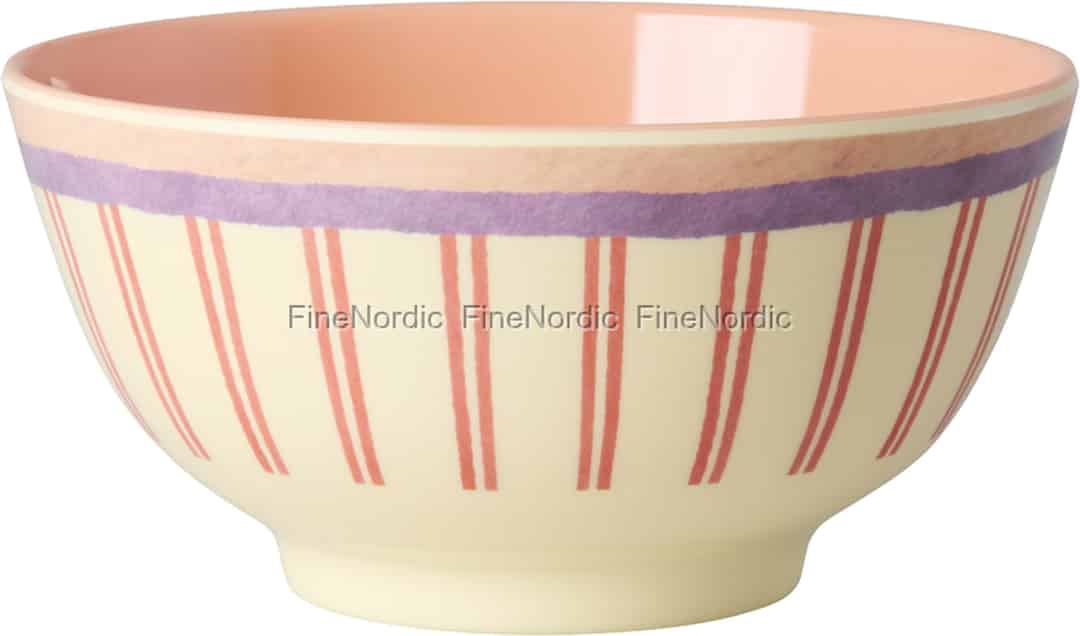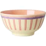 Forestil dig dit bord, levende med farver og latter. Denne herlige melaminskål fra Rice, med sine legesyge striber og varme ferskenfarvede indre, er designet til at bringe et strejf af glæde til dine daglige rutiner, fra morgenmaden til frokosten i haven.