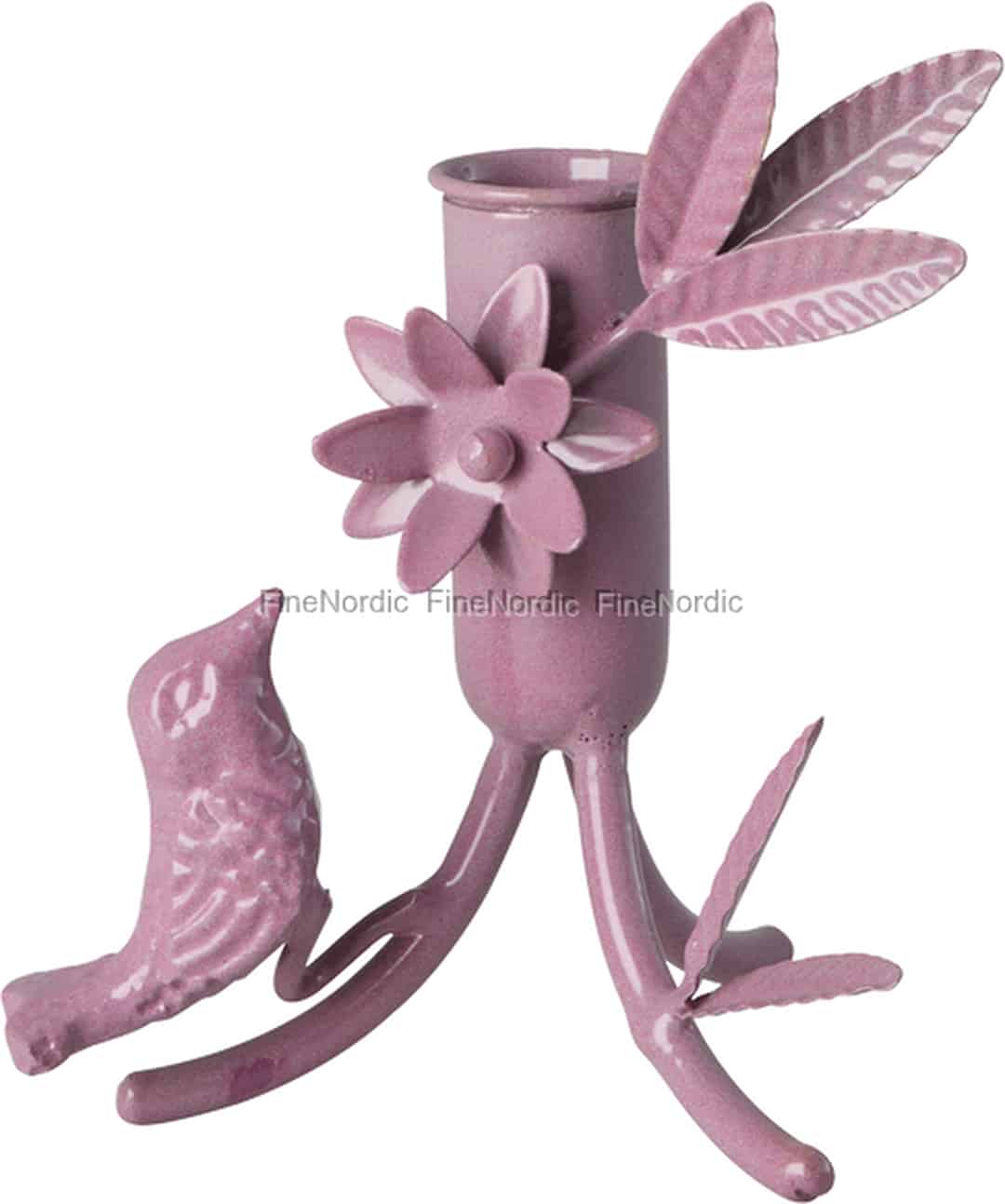 Lad denne fortryllende lysestage fra Rice føre dig til en finurlig have, hvor naturens mindste detaljer hyldes. Hvert element, fra den nysgerrige lille fugl på sin gren til den spinkle blomst og bladene, er skabt i metal og afsluttet med en smuk, spættet lavendelfarvet glasur. Det er et design, der fortæller en historie og inviterer dig til at stoppe op og værdsætte de enkle, glædesfyldte øjeblikke i din dag. Designet har en dejlig, håndlavet kvalitet, der føles både autentisk og fuld af karakter.