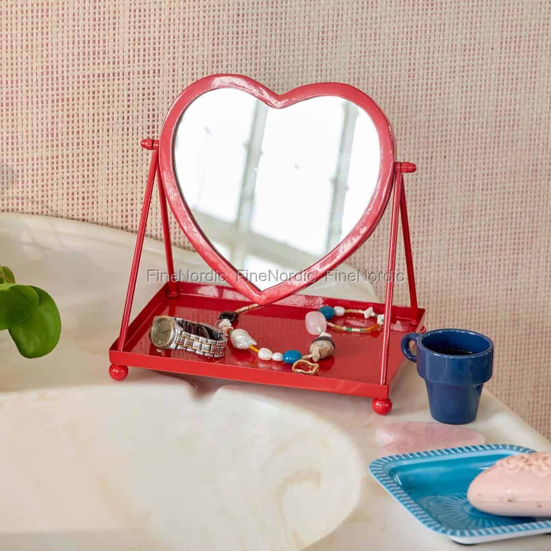 Fra Rices kreative verden er dette spejl en vidunderlig påmindelse om at finde glæde i de små øjeblikke. Dets blanke røde ramme, formet som et perfekt hjerte, er ikke kun til for at spejle dit ansigt; den er designet til at bringe et smil frem på dine læber. Forestil dig det på dit natbord eller sminkebord, hvor det fanger morgenlyset og tilføjer et modigt og selvsikkert farvestrejf til dit personlige rum. Det er et design, der føles både nostalgisk og vidunderligt moderne, og som forvandler en simpel daglig opgave til en handling af egenomsorg.