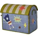 Fra den kreative verden hos danske Rice kommer en opbevaringsløsning, der simpelthen sprudler af glæde og karakter. Dette smukke hus er håndlavet af raffia, en naturlig palmefiber, der giver hvert enkelt produkt sin egen unikke tekstur og historie. Den livlige blå farve og det stribede grønne tag skaber en munter baggrund for de skønne, håndsyede superheltedetaljer – lige fra den flyvende helt til det energiske 'BAM!', der nærmest springer ud af kassen. Hvert et sting og hver en fletning vidner om den omhu og kunstneriske sjæl, der ligger bag disse vidunderlige kreationer.