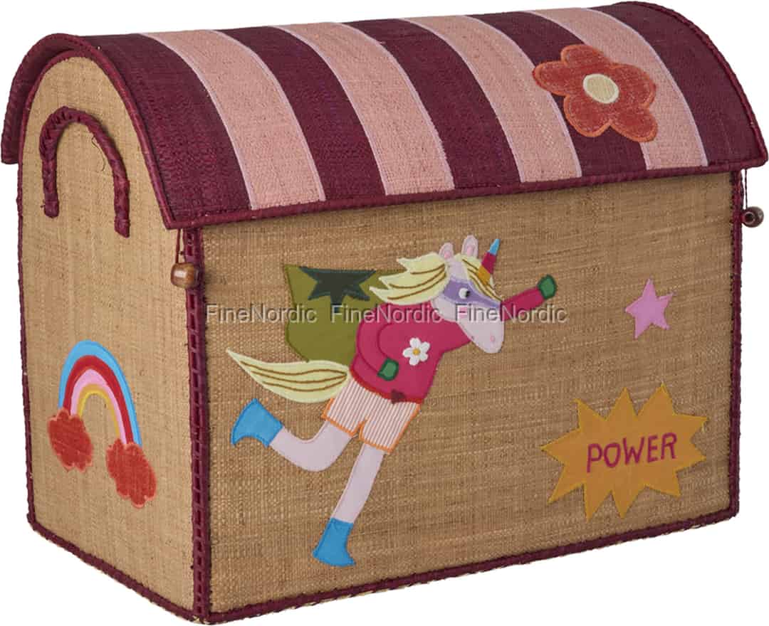 Oprydning bliver til et magisk eventyr med dette vidunderlige opbevaringshus fra Rice. Håndlavet af naturlig raffia, og med sine finurlige detaljer og en superhelte-enhjørning er det klar til at passe på dit barns allerkæreste legetøj og små skatte.