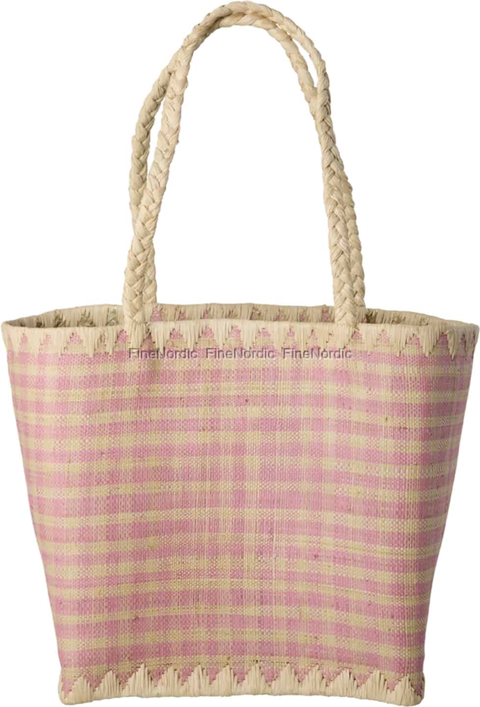 Rice Raffiataske - Lyserøde tern - Håndtag i raffia - Lille