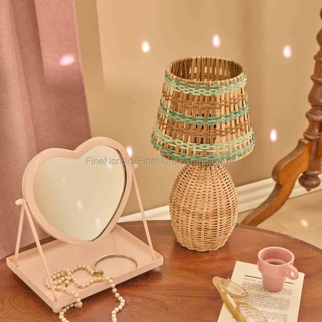 Oplev den herlige karakter af denne lille bordlampe fra Rice, et design, der perfekt indfanger mærkets passion for farver og tekstur. Hver detalje, fra den kunstfærdigt flettede raffiabase til den muntert stribede skærm, fortæller en historie om håndværk og glæde. Raffiaens naturlige toner komplementeres smukt af bånd i blød turkis og jordbrun, hvilket skaber et design, der føles både organisk og vidunderligt levende. Når lampen er tændt, kaster den et blidt, mønstret skær og forvandler dit rum til et fristed af varme og ro.