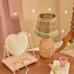 Forestil dig et blødt, mønstret lys, der fylder dit yndlingshjørne og kaster et mildt skær over dit sengebord eller din læsekrog. Denne charmerende lampe fra Rice bringer netop det – et strejf af håndlavet varme og glade farver til dit hjem, flettet af naturlig raffia.