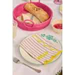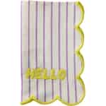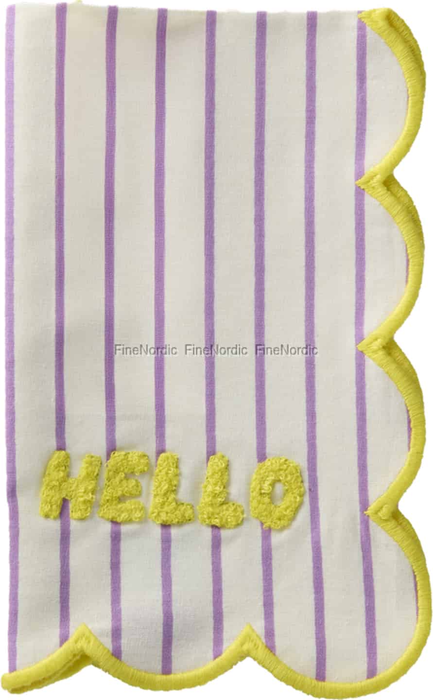 Fra Rice's kreative univers kommer en serviet, der er mere end blot bordtekstil – den er en invitation til at smile. Forestil dig at folde dette bløde stykke bomuld ud og afsløre den solrige 'HELLO'-hilsen. Kombinationen af blide lavendelstriber og den glade, gule bølgekant er ren lykke, designet til at lyse op ved måltiderne og sætte gang i snakken. Det er en lille detalje, der siger alt om din kærlighed til et hjem fyldt med varme og personlighed, og som forvandler selv det simpleste måltid til en skøn anledning.