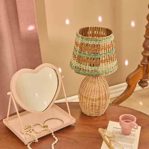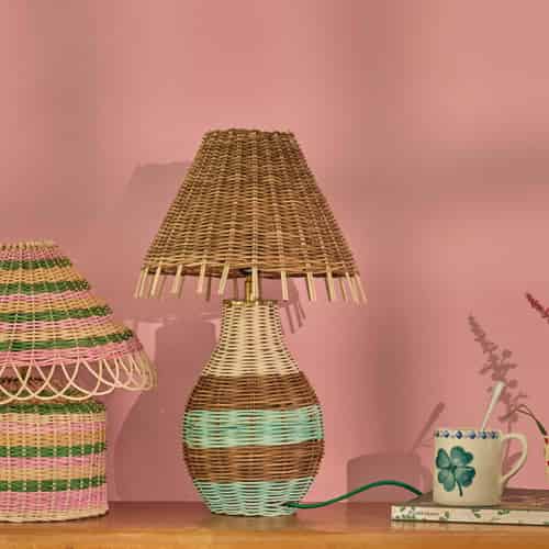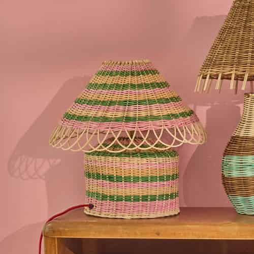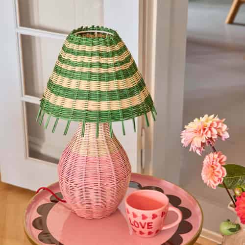 Rice Rattan bordlampe - Lyserøde striber - E27 fatning og 2-benet stik - Lav